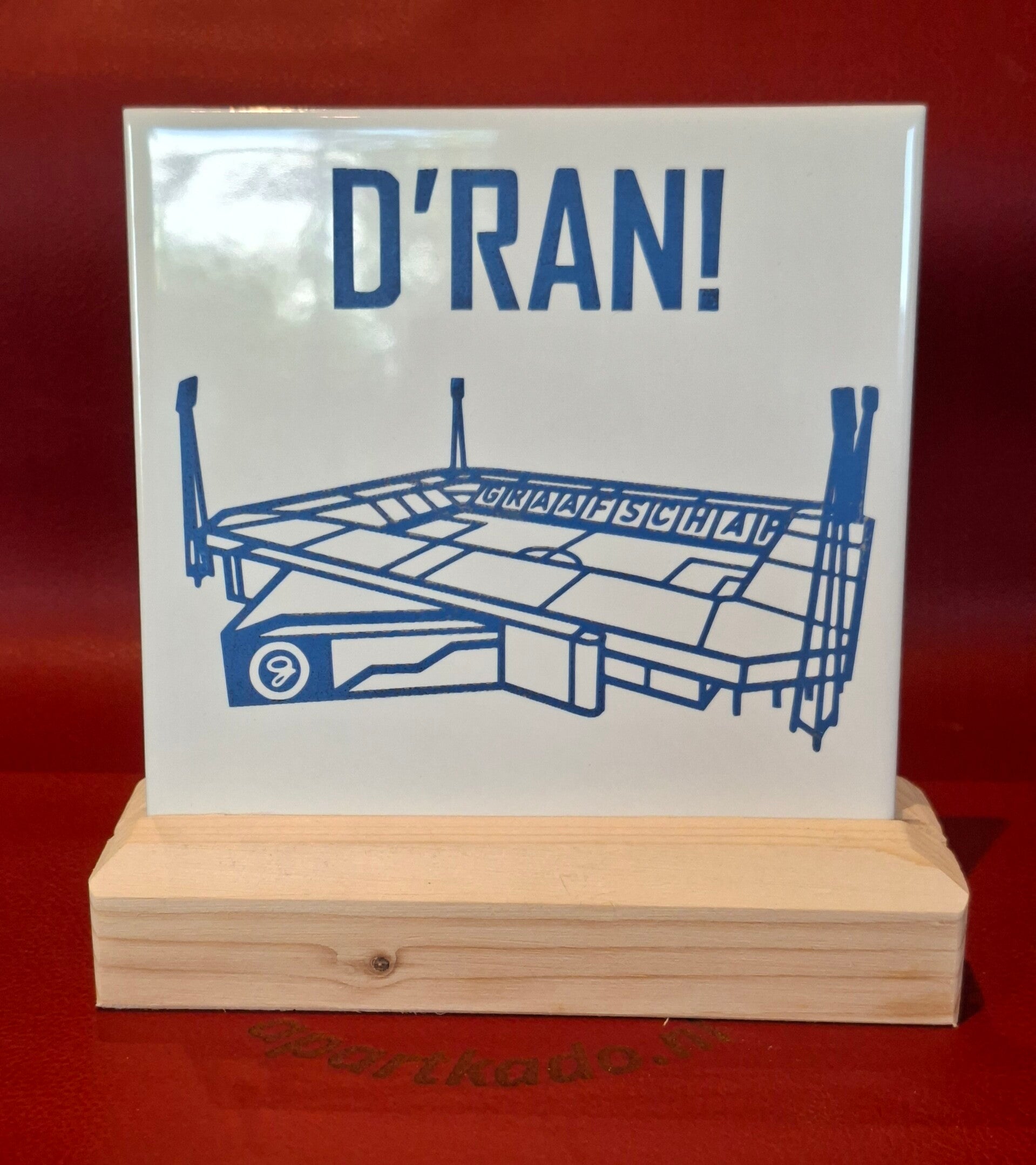 De afmetingen van de tegel is 15x15 cm en wordt geleverd met een houten houder.